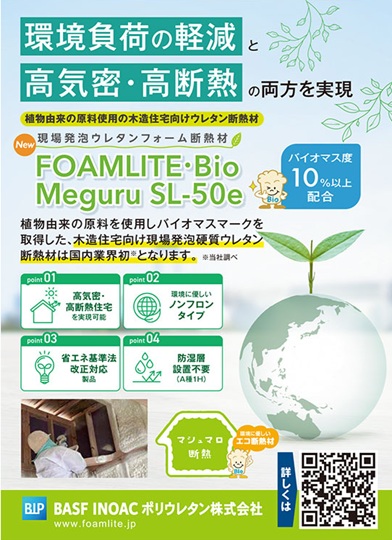 BASF INOACポリウレタン(愛知県新城市)がこのほど提供を開始した「FOAMLITE・Bio Meguru SL-50e」は、植物性由来の原料を使用した現場発泡ウレタンフォーム断熱材。植物由来原料を使用し、バイオマスマークを取得した木造住宅向け現場発泡硬質ウレタンフォーム断熱材は国内業界初という。