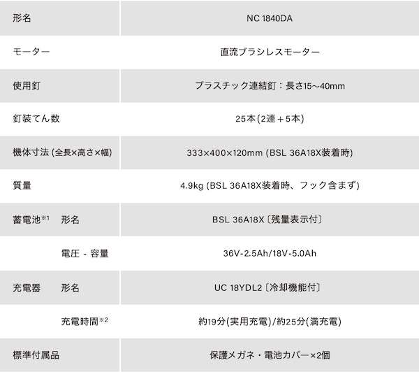 使用釘は指定のプラスチック連結釘のみで、マルチボルト蓄電池(BSL36A18Xほか)に対応する。