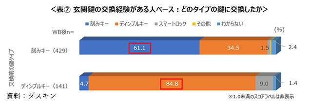 ダスキン(大阪府吹田市)が1月30日に公表した玄関鍵に関する調査結果によると、回答者の45.4%が側面にギザギザの刻みがある「刻みキー」を使用。40.4%が「ディンプルキー」、6.3%が「スマートキー」を使っていることが分かった。このうち防犯性の高い「ディンプルキー」は都市部での利用が進んでいる。また、鍵の交換を経験したことのある人は全体の25%で、交換時も以前と同じタイプの鍵を使う傾向がみられた。