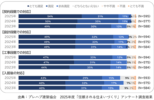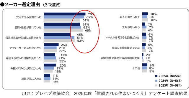 (一財)プレハブ建築協会が2月5日に公表した、2025年度の「信頼される住まいづくりアンケート」の調査結果によると、メーカーの選定理由は「安心できる会社だった」(70%)、「品質・性能が優れていた」(61%)、「営業担当者の説明に納得できた」(45%)が上位となった。このうち「安心できる会社だった」との回答は、前年度調査より3ポイント増加している。