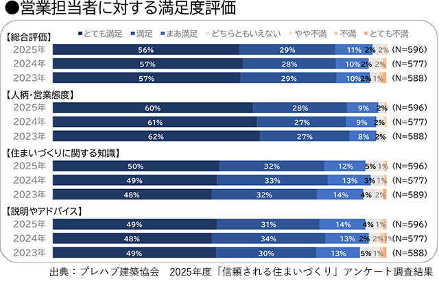 住宅に対する満足度では、「とても満足」(46%)と「満足」(38%)を合わせ、8割超が「満足」と回答した。営業担当者についても8割以上の世帯が「満足」と評価している。営業担当者への評価で最も多かったのは「人柄・営業態度」で88%。次いで「住まいづくりに関する知識」(82%)、「説明やアドバイス」(80%)の順となった。