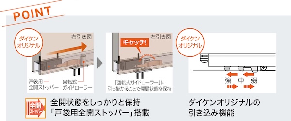 扉の全開状態を保持できる戸袋用全開ストッパーを搭載。引き込み機能により扉の閉まりぎわ約70mm手前の位置で引込装置が作動し、引戸を最後まで確実に閉める。