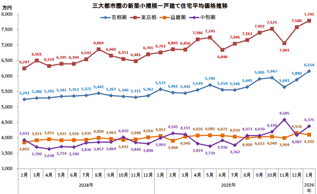 東京カンテイ(東京都品川区)が2月9日に発表した1月の首都圏における新築小規模一戸建て(土地面積50㎡以上100㎡未満)の平均価格は、前月比4.7%増の6154万円と連続上昇し、2014年4月の集計開始以降の最高価格となった。前年同月比も10%前後の水準が続く。