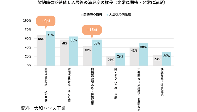 天井高に対する契約時点での期待と入居後の満足度を比較したところ、「自然光の明るさ」を期待していた人は契約時では43%だったのに対し、入居後では58%が「満足している」と回答した。「室内の開放感・広がり感」「空間の抜け感・ゆとり感」などその他の項目についても、期待を上回る満足度が示された。