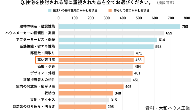 同調査によると、住宅を検討する際の重要項目として「建物の構造・耐震性能」(758人)、「アフターサービス・保証」(614人)、「断熱性能・省エネ性能」(592人)などの基本性能にかかわる項目が上位に。「高い天井」(468人)はそれらに次いでランクインしている。