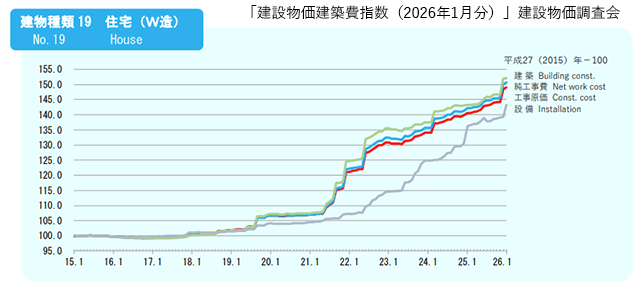 建設物価調査会が2月10日公表した2026年1月分の「建設物価建築費指数」(暫定値)によると、工事原価で見た木造住宅の建築費指数は149.0となり、前月比で0.4%(0.6ポイント)増加となった。前年同月比では6.1%(8.5ポイント)の増加となっている。