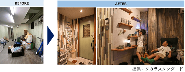 「エマウォール部門」では、シーエムシー一級建築士事務所(大阪府大阪市)が最優秀賞を受賞。マグネットが付けられるエマウォールインテリアタイプを使って、築21~30年のS造住宅をアメリカンスタイルの部屋にリフォームした。物置となっていた広い部屋にマグネット内蔵の木製棚を配置することで、大人の隠れ家や子どもたちの秘密基地として利用できる空間となった。