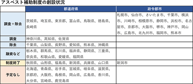 2025年4月1日時点の各自治体における、アスベスト対策への補助制度についても併せて公表。調査・除去に対する補助制度があるのは、東京都、埼玉県、富山県など16都県と、横浜市、名古屋市、大阪市、福岡市など19政令市。融資制度があるのは石川県、福井県、福岡県など10県。制度が終了したのは秋田県、福島県、新潟県など6県と新潟市、導入の予定なしは北海道、京都府、大阪府など15道府県だった。