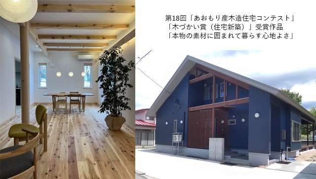 また、次点となる「木づかい賞(住宅新築)」には、企業組合県木住の「本物の素材に囲まれて暮らす心地よさ」を選出。県産材やホタテ貝殻粉末入りの漆喰といった自然素材を用いた住宅で、外壁を紺色の金属サイディングとスギ板の組み合わせで仕上げている。内装は自然塗料を塗布したスギ板のフローリングなどにより穏やかな色調でまとめた。講評では、県産材をふんだんに使用し、施主と工務店が二人三脚で住宅を作り上げた点が評価された。
