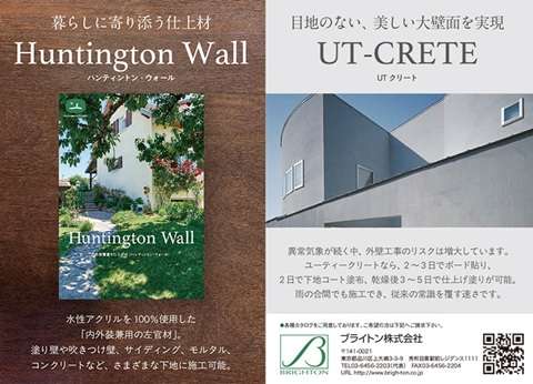 「Huntington Wall(ハンティントン・ウォール)」は、水性アクリルを100%使用し、スタッコラーストと同じような通気性能と弾性性能を持つ内外装兼用の左官材。自然な質感と高い意匠表現を実現しながら、モルタルやコンクリート、サイディングなど幅広い下地に対応する。耐久性にも優れ、3000時間の耐候試験もクリアしている。カラー展開は、同社独自のカラーマッチングシステムを使い、スタッコラーストの色から、約3000色のカラーバリエーションを実現。自分好みの色を作ることができる。