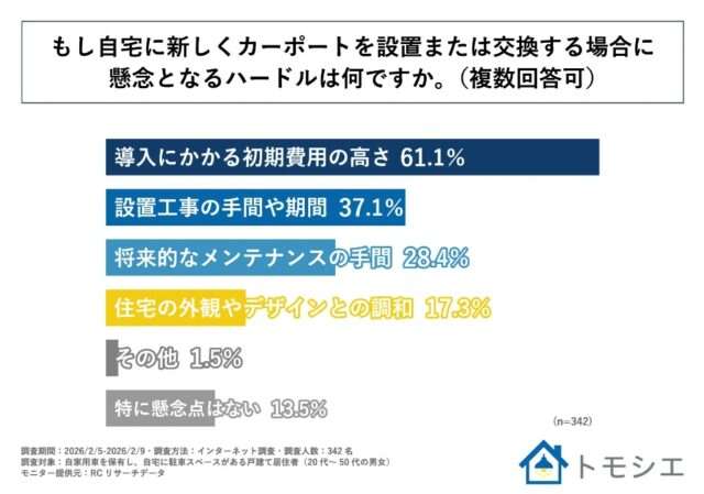 一方で、カーポートの新設・交換に際してのハードルについては、6割以上(61.1%)が「初期費用の高さ」を最大の懸念に挙げた。設置工事の手間や将来的なメンテナンスよりも、費用負担が意思決定を左右していることがわかる結果となった。