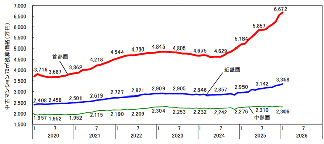 東京カンテイ(東京都品川区)が2月19日に発表した1月の首都圏における中古マンション70㎡あたりの平均価格は、前月比1.8%増の6672万円と18カ月連続で上昇した。