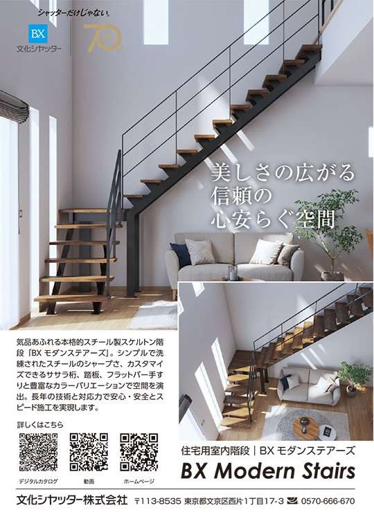 文化シヤッター(東京都文京区)は、オープンリビングに対応した住宅用室内階段「BX Modern Stairs(モダンステアーズ)」を販売する。シンプルで洗練されたスチールのシャープなデザインが空間に美しく調和する高い意匠性と、屋外鉄骨階段廊下ユニット「段十廊Ⅱ」で培った安心・安全設計を両立。また、受注から施工までの一貫した責任体制により、最短4週間の短納期を実現した。