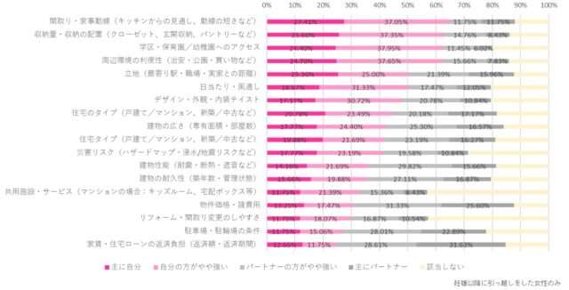 調査によると、住まい選択では母親が生活設計者として主導的に関わる傾向が強く、特に間取りや家事動線、収納、教育環境といった項目で母親の主導権が高いことが明らかになった。一方で、物件価格や諸費用、住宅ローンといった資金面は父親(パートナー)が重視する傾向が見られた。