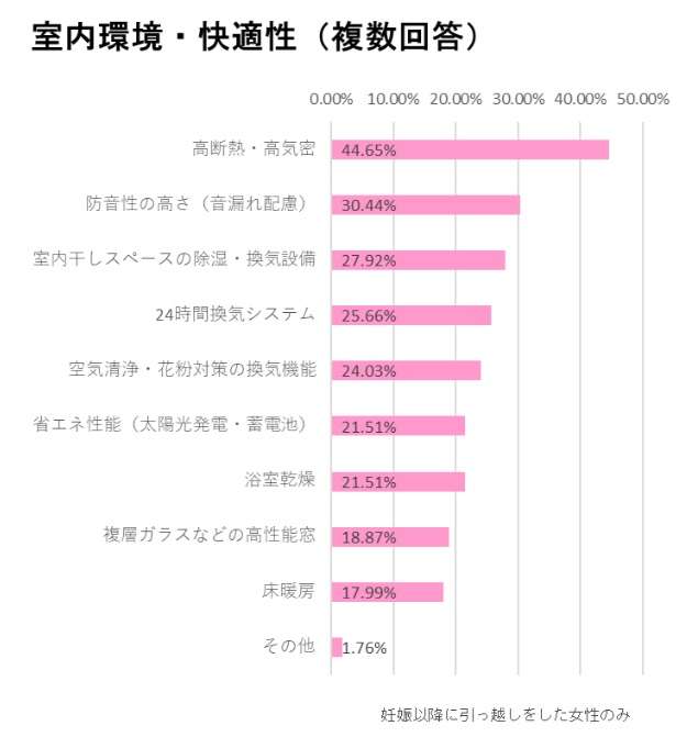 快適性や可変性では、「高断熱・高気密(44.65%)」や「防音性(30.44%)」など住宅性能の高さや「将来仕切れる子ども部屋(29.18%)」といった長期的な暮らし方の変化を想定した項目への評価も高かった。
