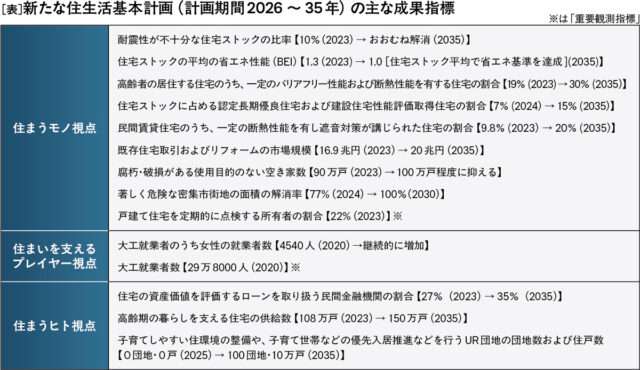 現在改訂が進む住生活基本計画の計画期間は2026~35年度。人口減少や高齢化、空き家の増加といった現状を踏まえ、2050年の住生活の姿を見据えて住宅政策の指針をまとめた。具体的には「住まうヒト」「住まうモノ」「住まいを支えるプレイヤー」の3つの視点に基づく目標を設定し、当面10年間で取り組む施策の方向性を固めた。