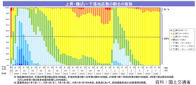 国土交通省は2月20日、主要都市の高度利用地など全国80地区における2025年度第4四半期「地価LOOKレポート」(25年10月~26年1月)を公表した。8期連続で住宅地・商業地の全地区で地価が上昇。このうち住宅地は15期連続、商業地は8期連続での上昇となった。横ばい・下落の地区はなく、変動率は6地区で「上昇(3~6%)」、74地区で「上昇(0~3%)」となっている。