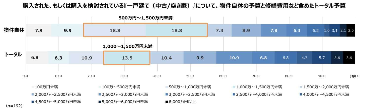 一方、修繕費やリノベーション費用を含めた「トータル予算」では、「1000万~1500万円未満」(13.5%)が最も多いものの、上の価格帯である「1500万~2000万円未満」(10.4%)、「2000万~2500万円未満」(9.9%)に回答が広がり、「1000万~2500万円未満」(33.8%)が中心層となった。購入者は、物件の価格を抑えつつ、リノベーション費用を見込んだ予算を組んでいることがわかる。