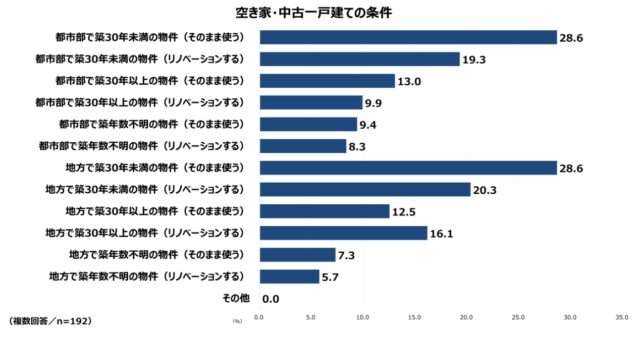 ジェクトワン(東京都渋谷区)は2月25日、空き家や中古住宅の購入を経験または検討している20~49歳の男女192人を対象に実施した「空き家・中古物件の購入に関する意識調査」の結果を発表した。どのような条件の空き家・中古物件を購入または検討しているか聞いたところ、「都市部で築30年未満の物件(そのまま使う)」「地方で築30年未満の物件(そのまま使う)」がいずれも28.6%でトップだった。築年数が比較的浅く、大きな改修が不要な物件が、都市・地方問わず選ばれやすい傾向にある。