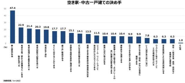 手軽さ、お得感を求める「税金が安く済む」(19.8%)、「すぐに入居できる」(17.7%)、「掘り出し物感がある」(17.7%)も多い。「信頼できる不動産会社や担当者が決め手」(13.5%)といった専門家への安心感を重視する層も一定数みられた。