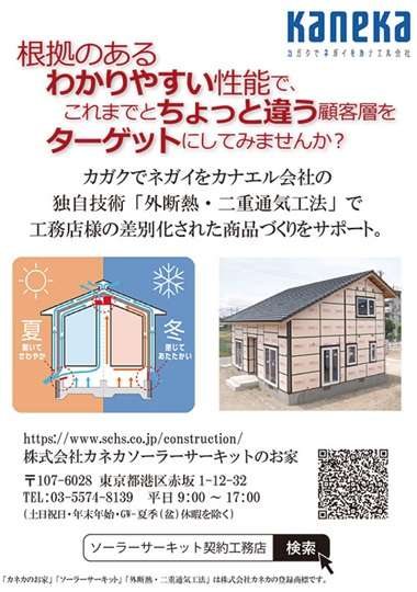 「ソーラーサーキットの家」は、カネカ独自の技術「外断熱・二重通気工法」で工務店の差別化された商品づくりをサポートする。夏は壁体内の二重通気層が気流をつくって床下ダンパーから熱と湿気を排出、冬は床下ダンパーを閉じて躯体の熱を逃しにくくする、パッシブを基本にした仕組みが特長。根拠のあるわかりやすい性能で「これまでとちょっと違う」顧客層をターゲットにできるとして、全国の地域工務店に対して提案を強化している。