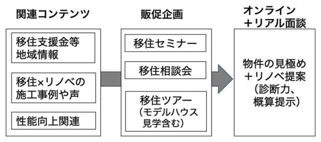 「リノベーション+エリア名」で検索上位表示されることはもちろん、モデルハウスを含めたリアルの見学、オンラインセミナー、相談会など、リアルとオンラインで「見る」「学ぶ」「相談」をバランスよく企画することで案件化する可能性が高まります。遠隔地であればあるほどオンラインを通じて依頼先を1社に絞り、現地訪問の際は最終確認という位置づけのケースも多いです。