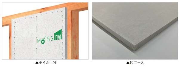 「モイスTM」は、けい酸カルシウム板をベースにバーミキュライトなどを配合した構造用壁材。天然素材を主成分とし、シックハウス症候群の原因物質をはじめとする有害物質を含まない。