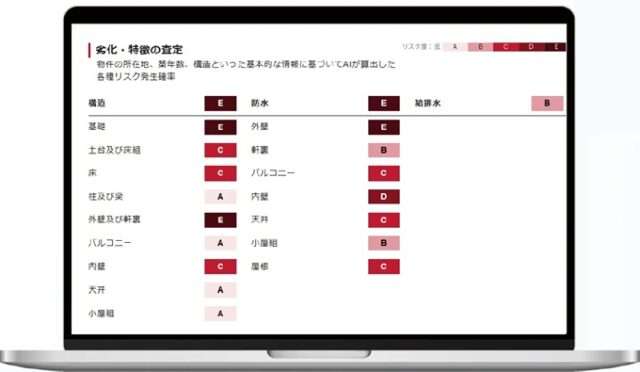 AIエージェントは、住所、建物構造、築年数といった基本情報を入力すると、「建物状況調査」の項目に沿って、構造に関する9項目、雨水浸入に関する7項目、給排水設備に関する項目の劣化リスクを推定する仕組み。過去の建物状況調査データに加え、気象条件や大規模地震の履歴などの外部データも組み合わせ、地域特性を反映した診断が可能となった。