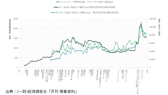 「工事費の80年」では、生コンクリート、型枠用合板、建築用木材といった主要資材の価格(東京)や、型枠工(建築)、電線管工事などの工事費用の推移をグラフで紹介。石油ショックやバブル景気と崩壊、阪神淡路・東日本大震災などの歴史的な社会情勢とともに、資材・工事価格がどのように推移したかを知ることができる。