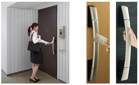 一般的な集合住宅向けの玄関ドアでは、カギ穴や電気錠ユニットが露出しているが、同社のスマートコントロールキーはすべての電気錠機能をドアハンドル内に収納。カギ穴や電気錠ユニットを見えなくすることでデザイン性と防犯性を向上した。