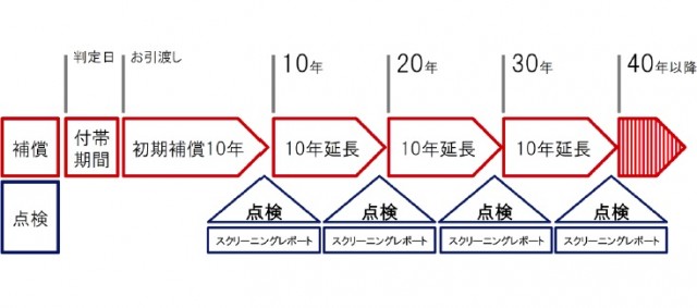 そこで同社では、建物が存在する間は補償を延長できるしくみを導入。10年ごとの更新時(有料)には、地盤インスペクター(地盤安心住宅整備支援機構主催の民間資格)が定期点検を行い、地形・土地履歴・近隣データから検討した「地盤スクリーニングレポート」を発行することで、最新の地盤リスク情報を取得できるようにした。