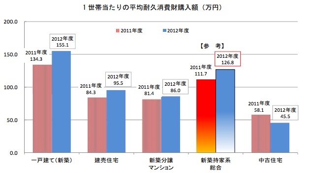 まず、家具や家電、設備、車などの耐久消費財の購入額を聞いた。それによると、新築の戸建て住宅を取得した世帯(511件)が最も高額で155万1000円。建売(308件)は95万5000円、新築分譲マンション(204件)は86万円、中古住宅(407件)は45万5000円だった。