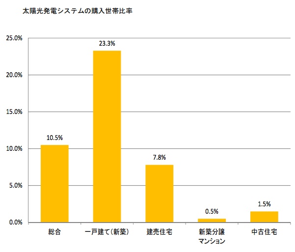 太陽光発電システムの購入世帯比率は10.5%(前年度は6.8%)に上昇。なかでも戸建て(新築)は、昨年度より8.3%多い23.3%となった。