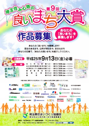 埼玉県の住まいに関わる団体、企業などでつくる埼玉県住まいづくり協議会(事務局:さいたま市、会長:風間健氏/高砂建設社長)は、県内にある住み心地のよいまちを多様な視点から推薦・PRする作品を募集するコンテスト「第9回 埼玉住み心地の良いまち大賞」を開催する。