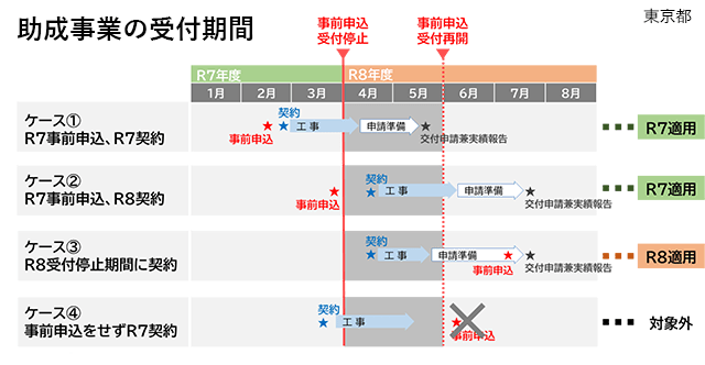 予算案の公表に伴い、25年度事業の受付は3月31日をもって終了。26年度の助成事業の事前申込みは5月末頃に再開する。4月1日以降の受付停止期間中に契約締結、契約・工事完了した事業については、各助成要件への適合などを条件に26年度事業の対象として受け入れる方針だ。