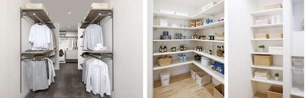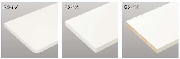 オープン収納に最適な「Rタイプ(4面エッジテープ貼り/R形状)」、背壁のみに設置するクローゼットに最適な「Fタイプ(4面エッジテープ貼り/ピン角形状)」、側壁に設置する内部収納に最適な「Sタイプ(1面エッジテープ貼り/ピン角形状)」の3タイプ。