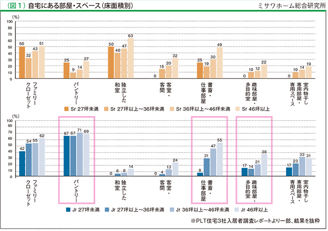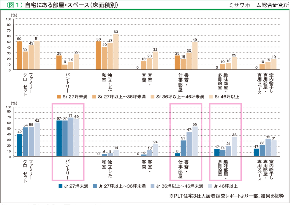 ミサワホーム総合研究所(東京都杉並区)がこのほど実施した「20年間の住まいの価値観変化」の分析結果によると、直近5年で住宅を建てたジュニアオーナーの間で「パントリー」など家事を効率的にこなすためのスペースや、「独立した仕事部屋」「趣味の部屋」にスペースを割く傾向が高くなっている。