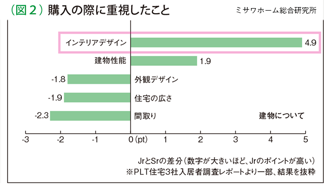 また、購入の際に重視したことを比較したところ、立地では「災害リスクが少ない」との項目で、シニアオーナーとジュニアオーナーのポイント差が顕著となった。建物については「インテリアデザイン」の項目で差が大きく開いた。ジュニアオーナーにとって「外観デザイン」「住宅の広さ」「間取り」以上に、日々過ごす内部空間の心地よさや自分好みのデザインが重要な軸となっている。