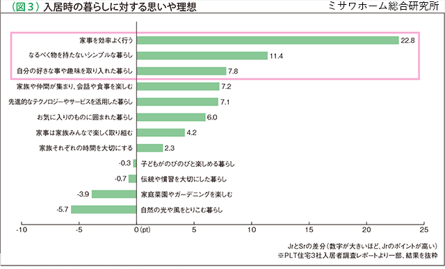 入居時に思い描いていた暮らしの理想については、共働き世帯の増加を背景に「家事を効率良く行う」の項目で、両者の回答の差が広がった。ジュニアオーナーの「なるべくモノを持たないシンプルな暮らし」「自分の好きなことや趣味を取り入れた暮らし」など、お気に入りのものに囲まれた暮らしを求める傾向も鮮明となっている。