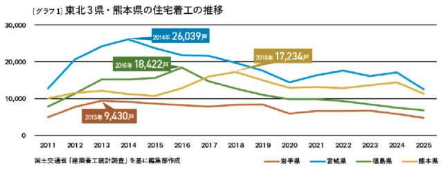 東日本大震災で被災した東北3県(岩手県、宮城県、福島県)および熊本県の、年間の住宅着工戸数の推移をグラフ化した[グラフ1]。全体的な傾向としてはおおむね1~2年後に最多戸数を記録しており、発災2年後には住宅再建の動きが本格化すると言えそうだ。福島県は原発事故の影響かピークが後ろにずれこんでいるものの、11年から12年にかけて一定の伸びを示している。