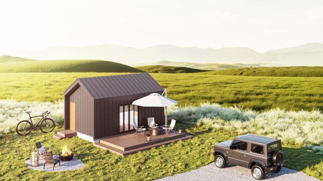 6坪モデルでは、三角屋根(切妻)構造を採用したことで、従来の片流れ屋根とは異なる横方向への広がりを可能にした。さらに勾配天井との組み合わせにより、約6坪というコンパクトサイズながら、LDK約7.6帖の開放的なワンルーム空間を実現した。本体価格は約770万(税込)。注文から引き渡しまで、約2カ月の工期で対応する。
