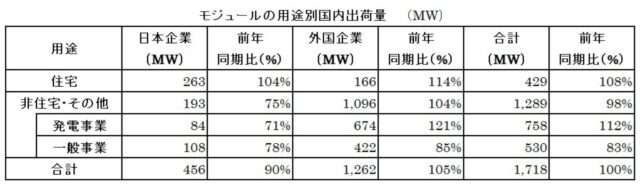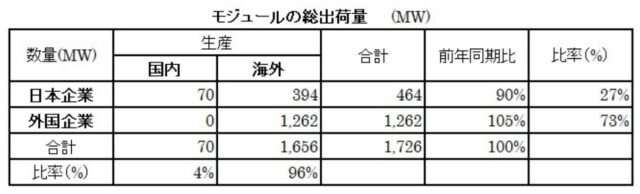 モジュール総出荷量のうち日本企業は464MW(同90%)と前年に続き減少した一方、外国企業は1262MW(同105%)と前年を上回った。総出荷量比率(日本:海外)は27:73で、前年より外国企業の比率が増加している。また、生産地別では国内生産4%:海外生産96% と、海外依存の傾向はほぼ変わっていない。