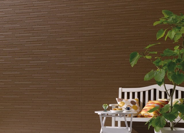 今回発売するのは、壁厚15ミリの15VZシリーズ「フォルタナVZ」。割肌とフラットな面のテクスチャーを組み合わせた変化のあるデザインとなっている。セルフクリーニング機能、塗膜15年保証付き。3色。15×455×1820。税込6213円/m2。