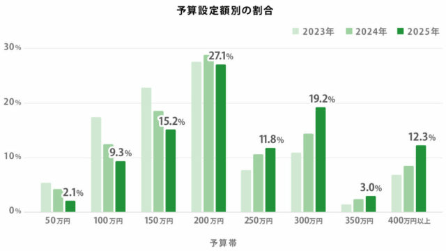 予算帯の構成比をみると、「300万円」帯が23年の10.87%から25年には19.24%まで上昇した。「400万円以上」も23年の6.87%から25年には12.31%へ上昇。一方、従来のボリュームゾーンである150万円以下は縮小傾向がみられる。50万円以下は23年の5.3%から25年に2.1%へ低下しており、市場全体での高価格帯へのシフトが目立った。