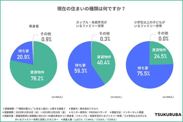 調査は、「単身者」、「カップル・未就学児がいる世帯」、「小学生以上の子どもがいるファミリー世帯」の三つの区分で計1017人を対象に実施。居住形態別では、単身者の約8割が賃貸に住むのに対し、小学生以上の子どもがいるファミリー世帯では約8割が持ち家となっている。ただ、持ち家世帯の約3割が現在の住まいに不満を感じていると回答。「持ち家だから満足度が高い」というわけではないことが分かった。