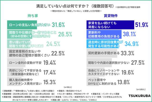 持ち家で不満がある人の課題は、「住宅ローンの支払い負担」(31.6%)に次いで、「間取りや仕様が画一的」(26.5%)が多い。賃貸物件に住み、不満があると回答した人の声では、「家賃を払い続けても資産にならない」が51.9%で最多。以下、初期費用や「更新料」(38.1%)、「退去時費用が発生すること」(34.9%)など、費用に関することを主な不満として抱えていることがわかった。
