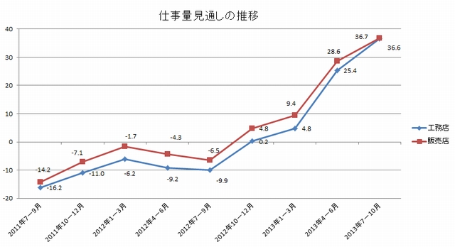 ジャパン建材(東京都江東区)がまとめた7-9月期の需要見通しによると、工務店段階では前期(4-6月期)よりも11.2ポイント上昇し、36.6ポイント、販売店段階でも8.1ポイント上昇の36.7ポイントといずれも仕事量が増加すると予測していた。仕事量予測は4四半期連続で上昇している。主要メーカーの販売予測もほとんどが増加と予測しており、減少予測はほとんどなった。