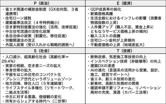 住宅およびリノベーション業界を念頭に置いて、政治・経済・社会・技術の4つの要素を整理してみたのが、以下の表です。