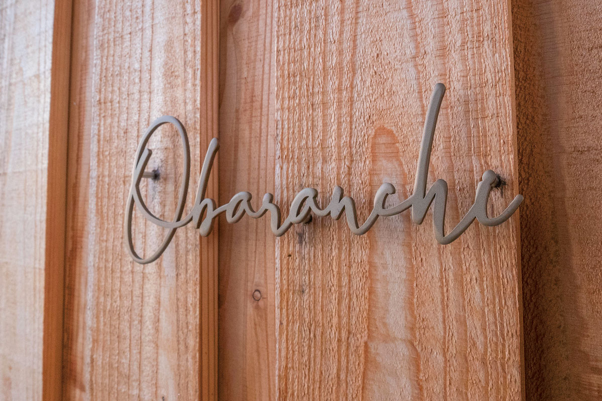 | 「Obaranchi」外観。正面のルーバーの奥に1階(民泊)の玄関があり、2階は右側面の玄関から入る。いわゆる二世帯住宅のつくり(上)。太陽光発電も搭載しBELSの5つ星を取得(左下)(写真提供:Obaranchi)。外壁のロゴ。外壁材は屋久杉(右下)(撮影:編集部) | |