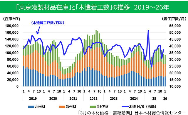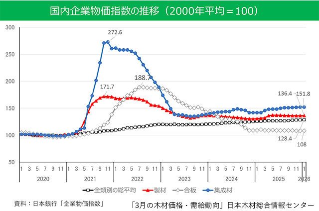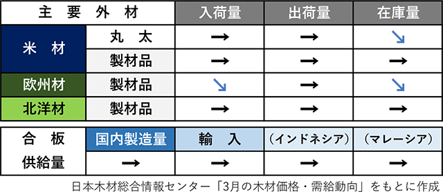 構造用集成材は、2月のラミナ入荷が前月比で28%減少したが、在庫は十分な水準にある。一方で、ホワイトウッドラミナは高騰により不足感が継続。円安傾向により、今後も原材料単価の上昇が続くとみられる。今のところイラン情勢の直接の影響はないが、今後コンテナ問題に発展する可能性がある。